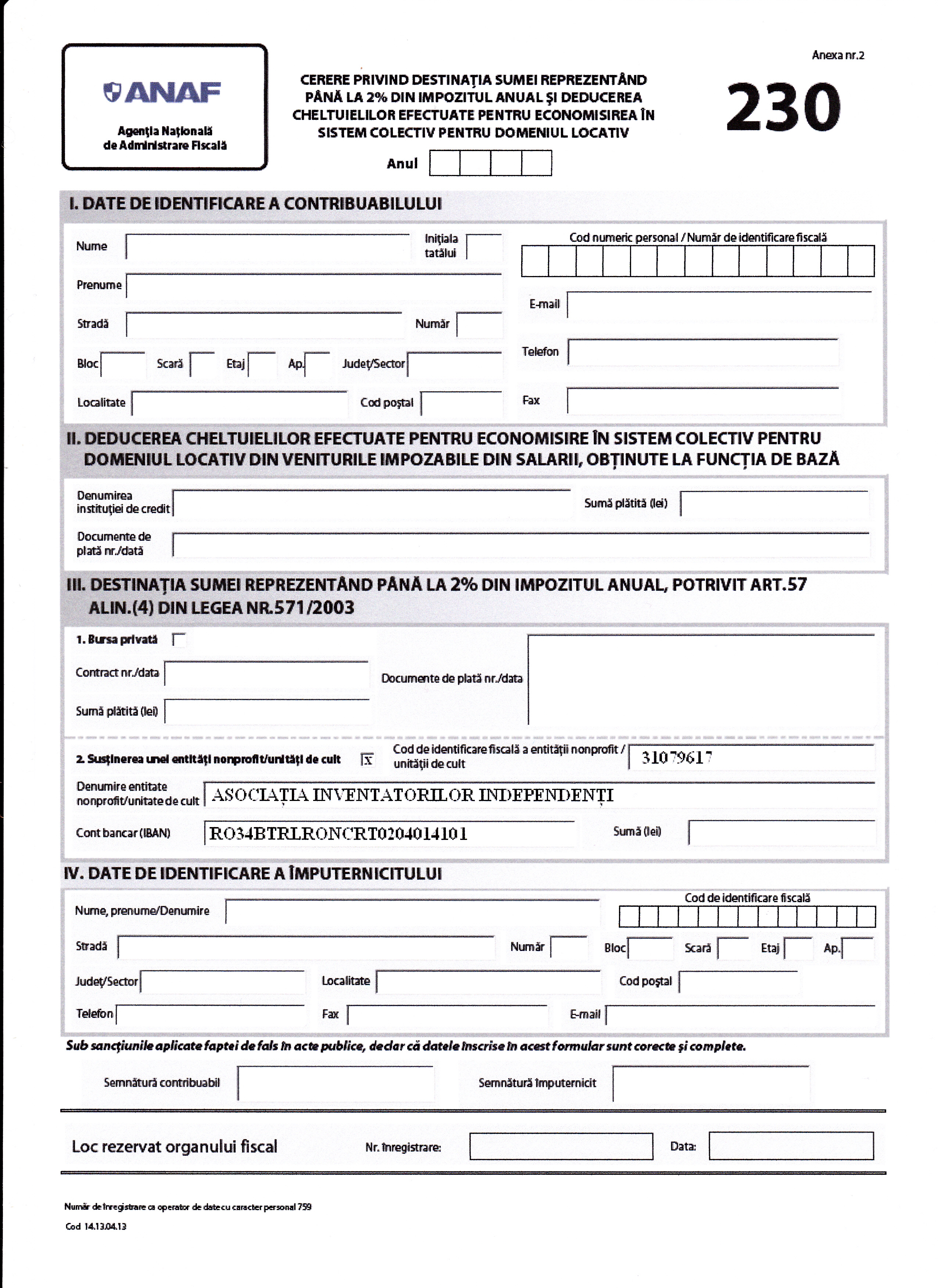 Daca doriti ca, prin redirectionarea a 2% din impozitul pe care dumneavoastra l-ati platit statului pentru salariile din anul 2014, sa sprijiniti ASOCIATIA INVENTATORILOR INDEPENDENTI, completati si depuneti, formularul 230 (in cazul impozitului pentru salarii) sau formularul 200 (daca ati avut si alte venituri in afara salariului), astfel: