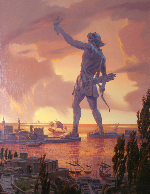 Imensa statuie din bronz, de 32 de metri inaltime, a fost construita pe parcursul a 12 ani, fiind desavarsita in anul 280 i.Hr. Locuitorii din portul Rodos, asediati timp de zeci de ani de Demetrios Poliorketes, au reusit sa invinga, in anul 292 i.Hr., armata tiranului, iar din vanzarea echipamentelor abandonate de acesta au hotarat sa faureasca cea mai inalta statuie a zeului Soarelui, Helios.